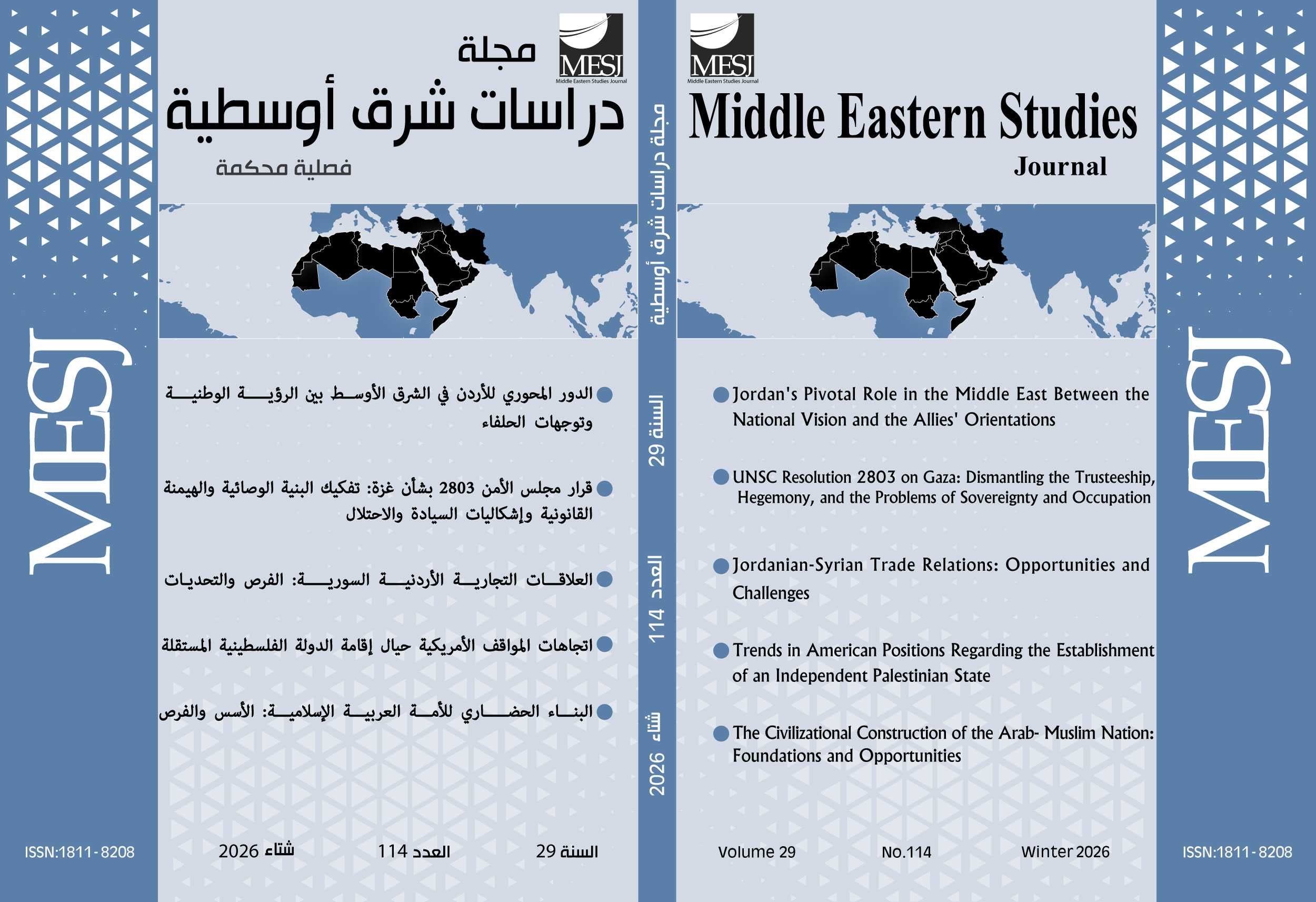 ضمن إصدارات مركز دراسات الشرق الأوسط/ الأردن وبالتعاون مع المؤسسة الأردنية للبحوث والمعلومات صدر العدد 114 من مجلة "دراسات شرق أوسطية" شتاء 2026، وعالج موضوعات وقضايا متعددة وراهنة على ساحة العالم العربي والشرق الأوسط. يتناول المقال الافتتاحي "الدور المحوري للأردنّ في الشرق الأوسط بين الرؤية الوطنيّة وتوجّهات الحلفاء"، والذي يهدف إلى تعزيز المقاربة السياسية والفكرية الأردنيّة التي انتهجتها المملكة بنظامها ومؤسساتها وقواها السياسية والاجتماعية خلال مائة عام من عمر الدولة، من خلال صناعة نموذج متقدّم في التوازن بين متطلبّات الخارج وضرورات الداخل الوطنيّ، والمحافظة على الثوابت والمصالح العليا، وتعزيز الاستقرار، وسدّ الباب أمام أي محاولات خارجية للعب بأمنه وسيادته. وتهدف الدراسة الأولى في العدد بعنوان "قرار مجلس الأمن 2803 بشأن غزة تفكيك البنية الوصائية والهيمنة القانونية وإشكاليات السيادة والاحتلال.. دراسة قانونية نقدية"، والتي أعدّها د. محمد خليل الموسى- الأردنَ، أستاذ فلسفة القانون، تحليل التحولات في موقع القانون الدولي وأدواته في إدارة النزاعات، ولا سيما في سياق القضية الفلسطينية، وترصد إشكالية القرار الذي يعيد تشكيل البيئة السياسية والأمنية في غزة عبر هندسة جديدة تُخضع الإقليم لإدارة دولية انتقالية تحت رعاية الأمم المتحدة، بحيث يُمنح "مجلس السلام" صلاحيات واسعة لإدارة الخدمات والمؤسسات، فيما تُمنح "قوة الاستقرار" تفويضاً مفتوحاً باستخدام "جميع التدابير اللازمة"، بما يفتح الباب أمام نموذج وصاية ذات طابع عسكري ويُنتج فراغاً في المساءلة القانونية ومجالاً محتملاً للإفلات من العقاب. وناقشت دراسة ""تداعيات الحرب الإسرائيلية- الأمريكية ضدّ إيران على العالم العربي"، التي أعدها د. قاصد محمود- الأردنّ، خبير في الشؤون الاستراتيجية العربية، قدرة حكومات العالم العربي على احتواء التداعيات السلبية للحرب عليه، بما يؤدي إلى انخفاض مستوى التهديد لاستقرار المنطقة وللأمن القومي العربي. وقد اعتمدت الدراسة على المنهج الوصفي- التحليلي ومنهج تحليل النظم، من خلال تحليل بيئة الحرب، ودوافع أطرافها، وتتبّع تداعياتها وسيناريوهات التعامل معها. وخلُصت الدراسة إلى أن هذه الحرب، إلى جانب تداعياتها، شكلت نموذجًا لخلق أزمة في العالم العربي. وقد ساهمت عوامل عديدة في تصعيد هذا التهديد لأمن المنطقة واستقرارها. ومن أهمها: 1) تردد الحكومات العربية في اتخاذ موقف حاسم، 2) انتهاك سيادة بعض الدول العربية أو تعريض مواطنيها للخطر، 3) تباين المواقف الرسمية بشأن تداعيات الحرب ونتائجها، 4) تزايد المخاوف العربية من هيمنة أحد الأطراف المتحاربة على المنطقة وتنفيذه لمخططاته لإعادة رسم خريطة الشرق الأوسط. في حين سعت دراسة "البناء الحضاريّ للأمّة العربية الإسلامية: الأسس والفرص"، التي أعدها د. عودة الجيوسي- الأردن، باحث في التنمية المستدامة والابتكار، إلى توضيح مدى إدارك الفكر العربي الإسلامي للفرص البارزة لتقديم بناء حضاري حديث ومتقدّم يخدم البشرية جميعاً، حيث تجري الدراسة عبر منهج وصفي تاريخي مقارن عملية مقارنة بين الأسس الفكرية لكلّ من الحضارة الإسلامية والحضارة الغربية. فيما تناولت الدراسة الأخيرة في باب البحوث والدراسات "اتجاهات المواقف الأمريكية حيال إقامة الدولة الفلسطينية المستقلة"، والتي أعدتها د. سوسن إسماعيل العساف- العراق، أستاذ العلوم السياسية/ جامعة النيل الأوروبية-لندن، وباحثة متعاونة مع مركز دراسات الشرق الأوسط/ الأردن. الدوافع المنشئة للمشاريع التي طرحتها الإدارات الأمريكية لإقامة الدولة الفلسطينية أو حل الدولتين، والتحديات التي واجهتها، سواء على الصعيد الإسرائيلي أو الفلسطيني- العربي أو الأمريكي- الدولي، وتوضّح كيف أنّ مسألة إقامة الدولة الفلسطينية المستقلة قد جرى التعامل معها غربياً وأمريكياً وإسرائيلياً حتى اُفرِغَت من مضمونها، وتقلصت مساحة الأراضي الفلس